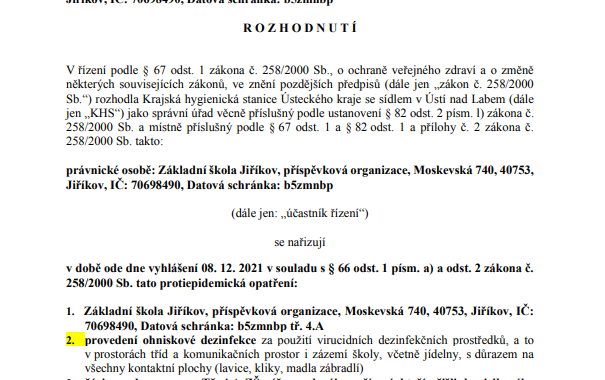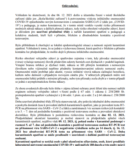 na základě obdržení zprávy z KHS Vám sděluji informaci, že žáci 4. A, (vyjma K. N., A. O. a V. Z. – viz zpráva třídní učitelky ve Škole On-Line) a někteří žáci ze 4. B, 3. A, 2. A (opět viz zpráva ve Škole On-Line) musejí do doby provedení testu PCR zůstat v karanténě. Výuka jim bude poskytována distančním způsobem. Prezenční pak bude zahájena ve chvíli, kdy se jí bude moci znovu účastnit 50% žáků. Žákům, na které se karanténa nevztahuje, bude nadále poskytována prezenční výuka.